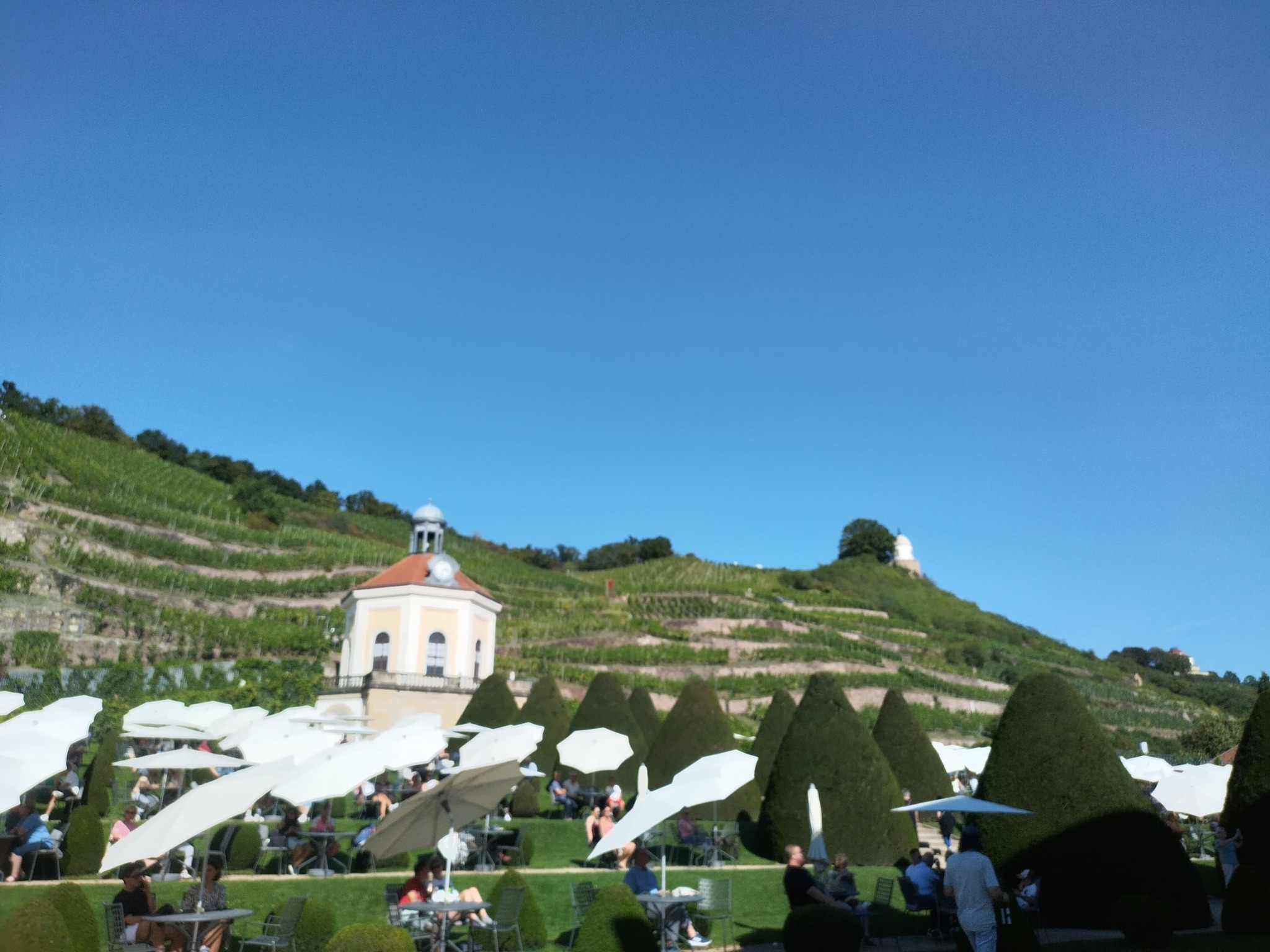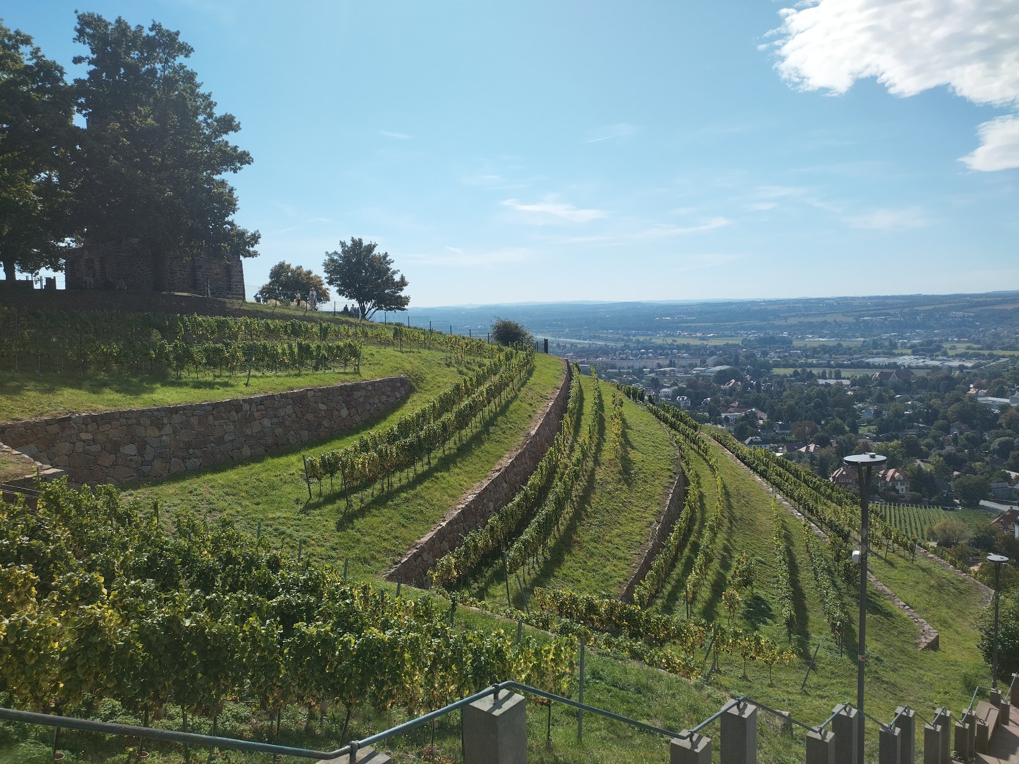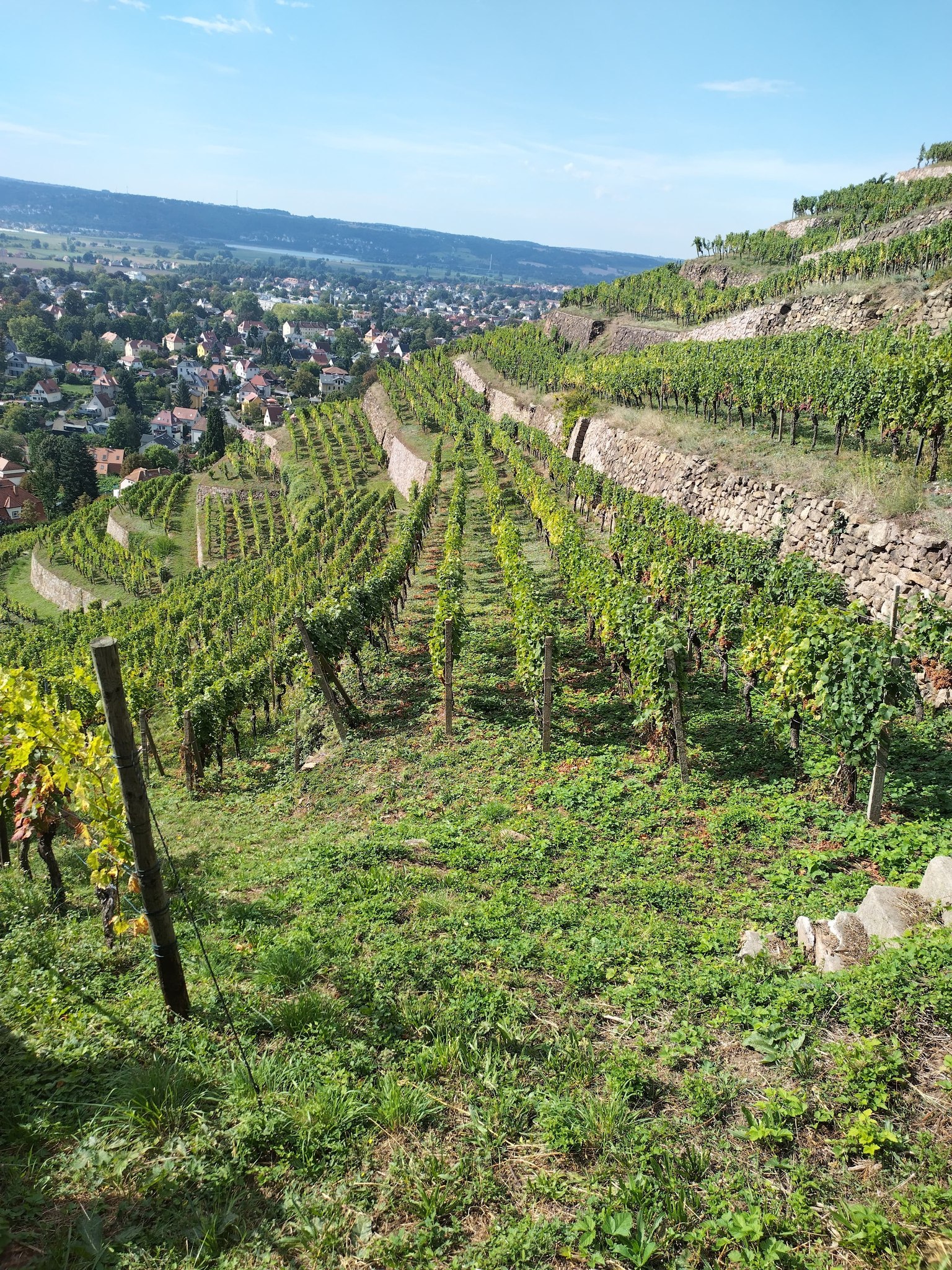 In Radebeul angekommen, ging das bei sehr hohen Temperaturen auf eine 10,5km Tour mit 300 Höhenmetern. Und wer 300m hoch läuft, muss auch wieder 300m hinab. Teilweise über Stock und Stein. Aber fast immer entlang von Weinstöcken und Straußenwirtschaften.
