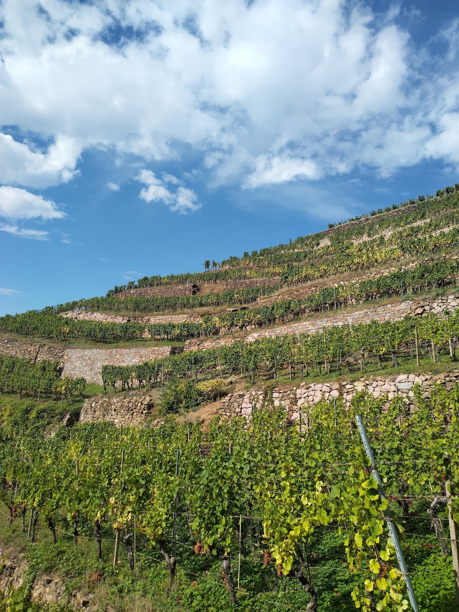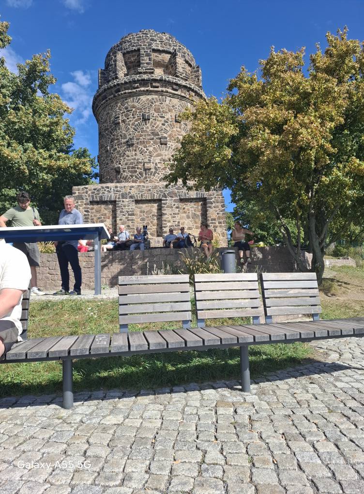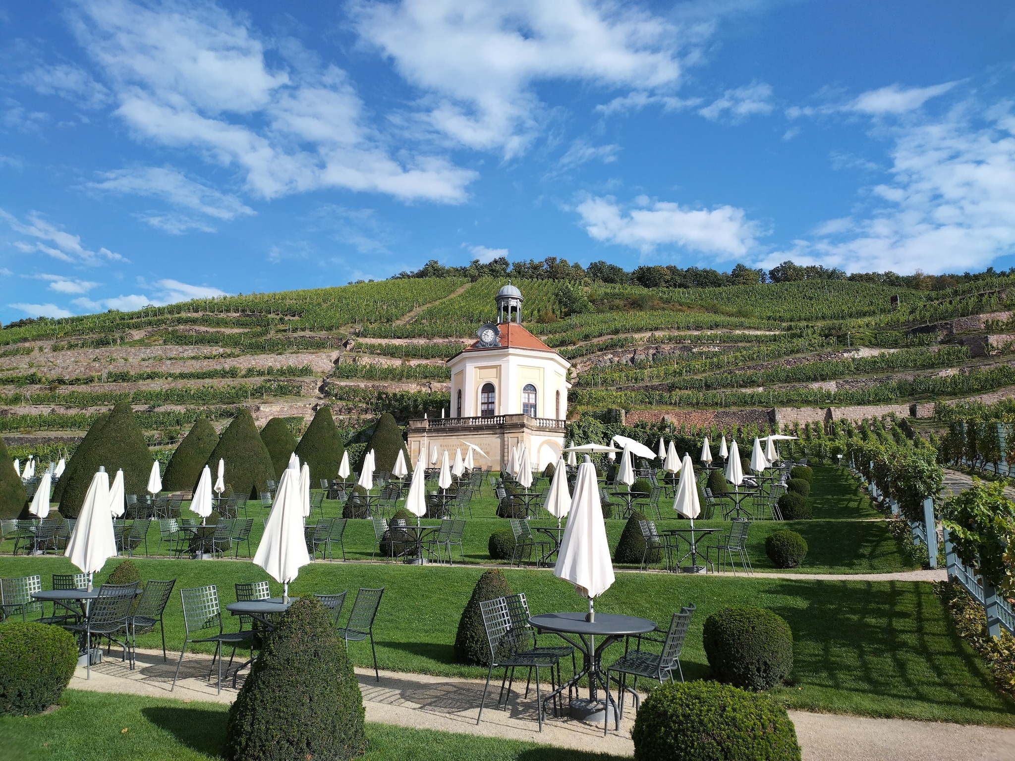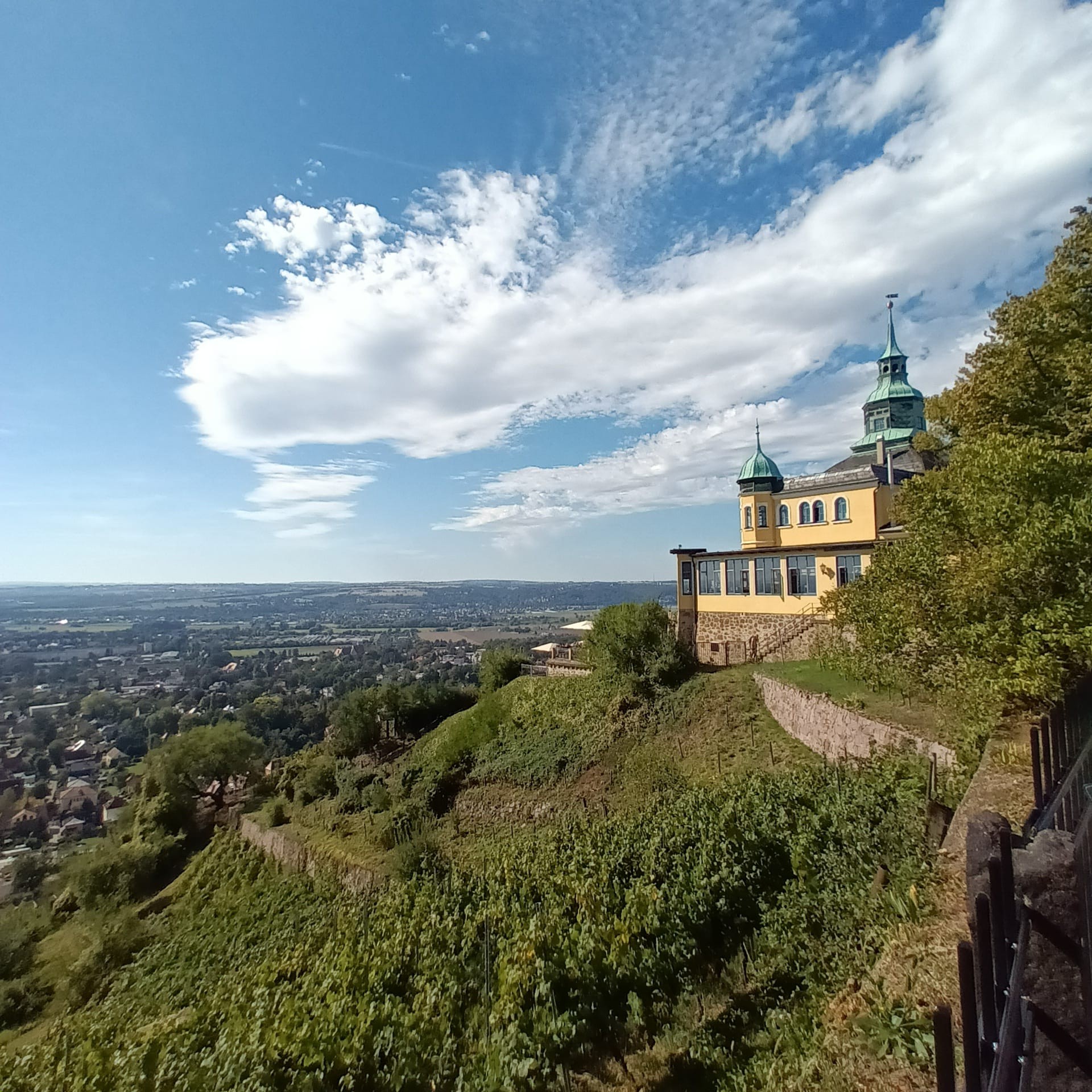 In Radebeul angekommen, ging das bei sehr hohen Temperaturen auf eine 10,5km Tour mit 300 Höhenmetern. Und wer 300m hoch läuft, muss auch wieder 300m hinab. Teilweise über Stock und Stein. Aber fast immer entlang von Weinstöcken und Straußenwirtschaften.